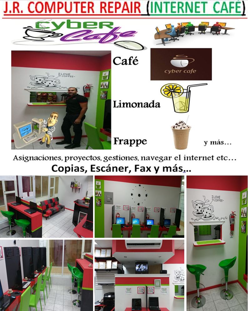 Saludos a todos los clientes, amigos, futuros clientes, estudiantes, profesionales y público general bienvenidos a J.R. COMPUTER REPAIR (INTERNET CAFÉ) 787-587-4122. Nos especializamos en Reparación de computadoras, Tablet, ventas y otros servicios. Les invitamos a visitar nuestras facilidades localizadas en Galerías Salinas, Calle Luis M. Rivera #18 en Salinas P.R. Agradecemos a todos por el apoyo, sus bendiciones e invitarlos a que continúen con su apoyo compartiendo, dándole LIKE y enviándonos solicitudes de amistad a nuestros dos enlaces en Facebook José Rubén Vázquez (jrcomputerrepair) y tambien Ruben Vazquez (jrcomputerrepair). Tambien en Instagram (rubenzaider) y en Twitter (José Vázquez) y así conocer más sobre todos los servicios con los que ya contamos y los nuevos servicios que seguiremos añadiendo en nuestras facilidades para el disfrute, y beneficio de todos ustedes. Venga visítenos será siempre bienvenido a: J.R. COMPUTER REPAIR (INTERNET CAFÉ)
